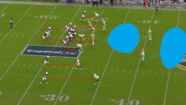 This is also an example of the outside cornerbacks playing outside leverage, rather than inside leverage because the offense is in a condensed set.