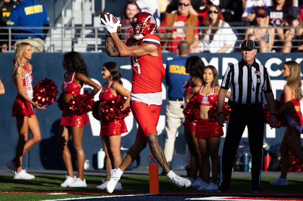 Arizona Wildcats wide receiver Tetairoa McMillan catches the ball to make a touchdown against the Houston Cougars. / Aryanna Frank-Imagn Images
