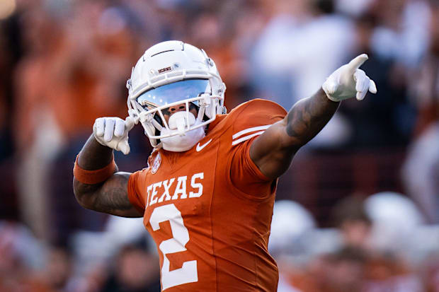 Texas Longhorns wide receiver Matthew Golden celebrates a big play against the Clemson Tigers. / Sara Diggins/American-Statesman / USA TODAY NETWORK via Imagn Images