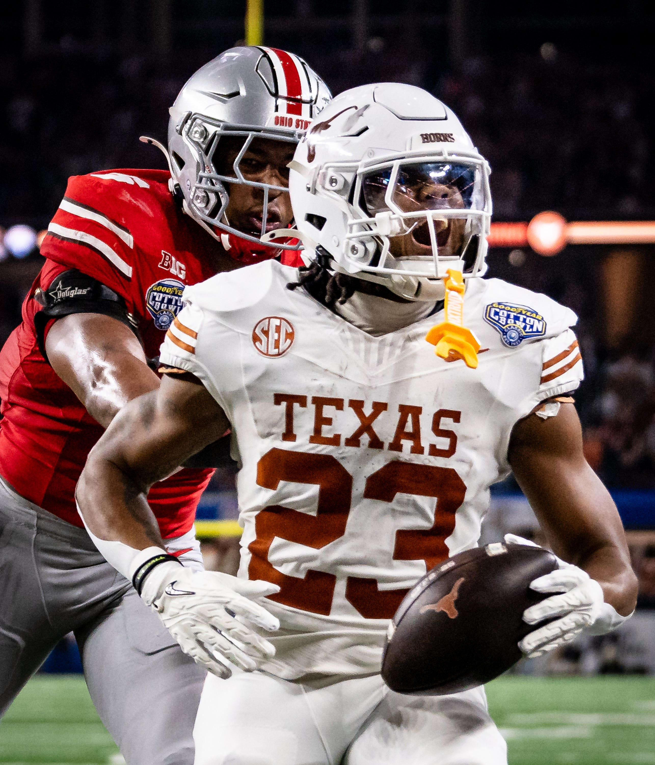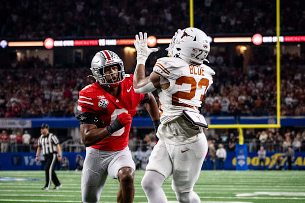 Texas Longhorns running back Jaydon Blue scores a touchdown against Ohio State Buckeyes in the College Football Playoff semi-final. / Sara Diggins/American-Statesman / USA TODAY NETWORK via Imagn Images