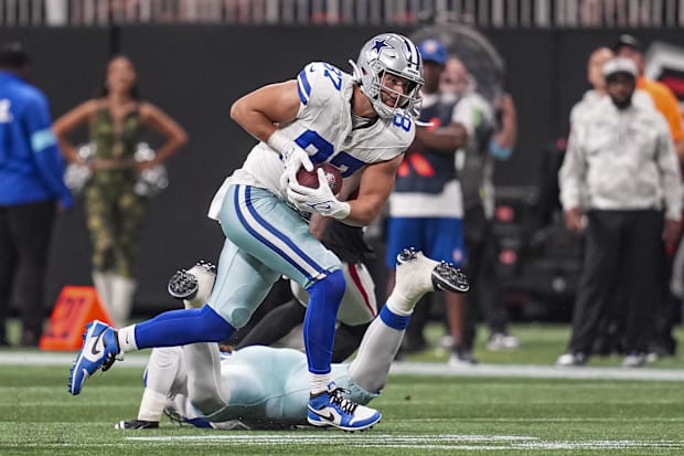 Dallas Cowboys tight end Jake Ferguson runs after a catch against the Atlanta Falcons. / Dale Zanine-Imagn Images
