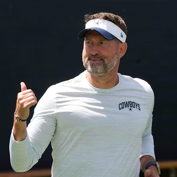 Dallas Cowboys coach Brian Schottenheimer at training camp at the River Ridge Fields. / Kirby Lee-Imagn Images